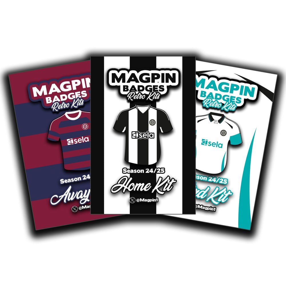 Enamel pin badges of our Home, Away and Third kits for the 24-25 season.